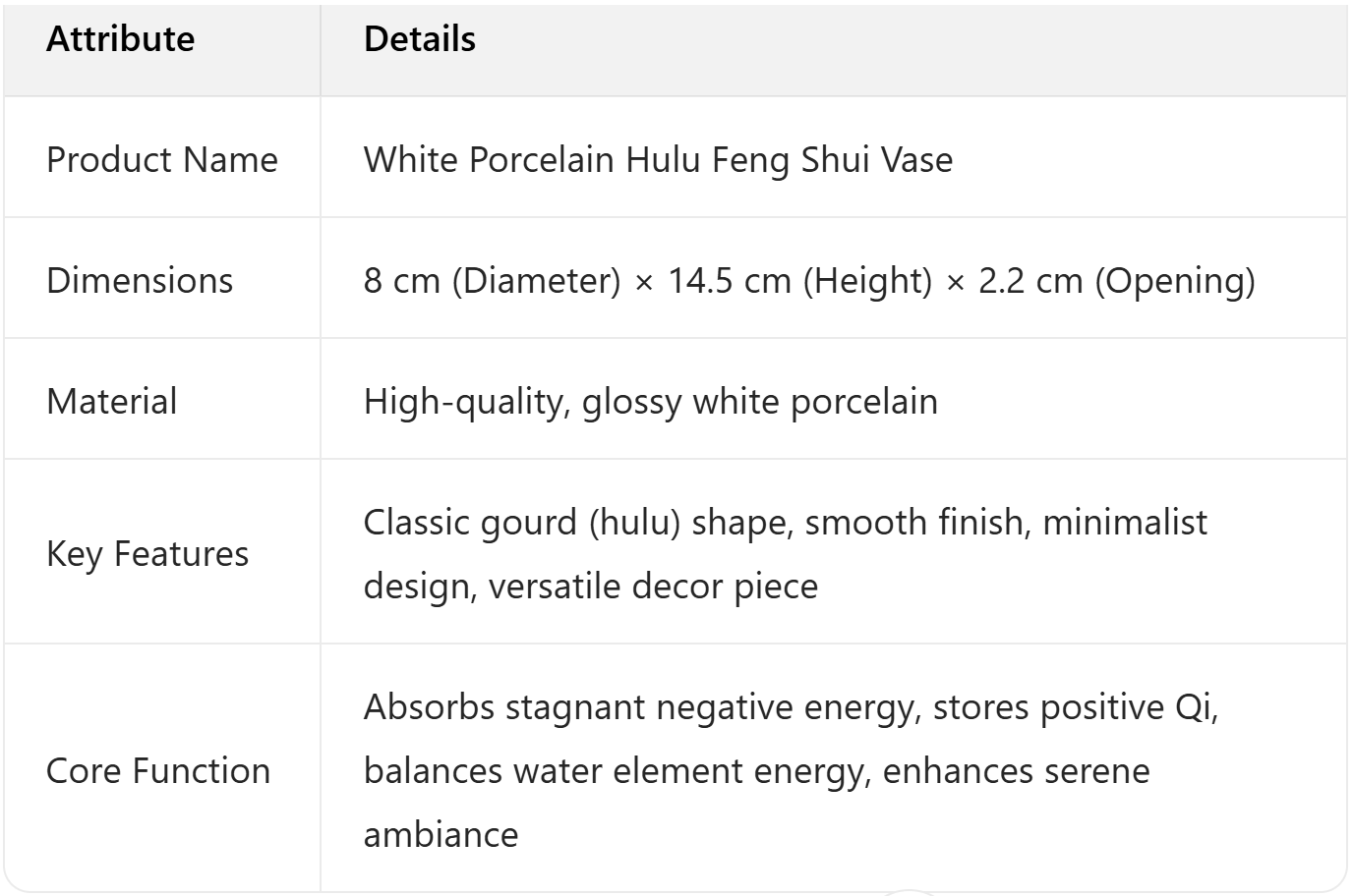 Elevate your bathroom’s energy with our elegant White Porcelain Hulu Vase, a timeless Feng Shui symbol of purification and protection. The iconic gourd (hulu) shape is believed to trap and neutralize negative energy while preserving positive Qi, making it ideal for balancing the water-dominant energy of bathrooms.