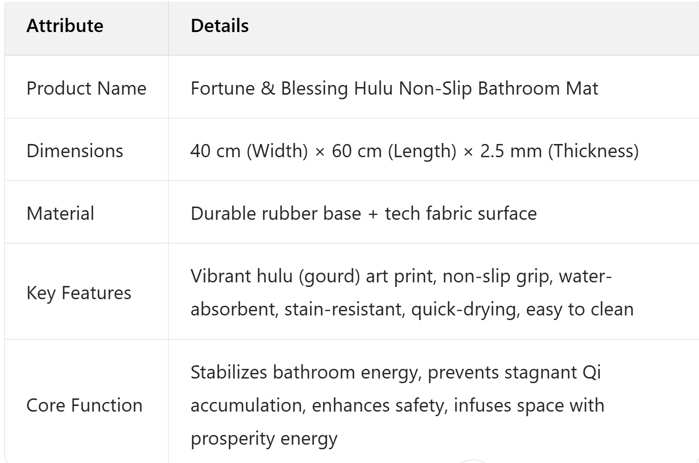- Fortune & Blessing Hulu Mat: Position it in front of your shower, bathtub, or sink to create a stable, energy-balanced foundation. Its non-slip design ensures safety, while the hulu print reinforces positive energy flow in your bathroom.