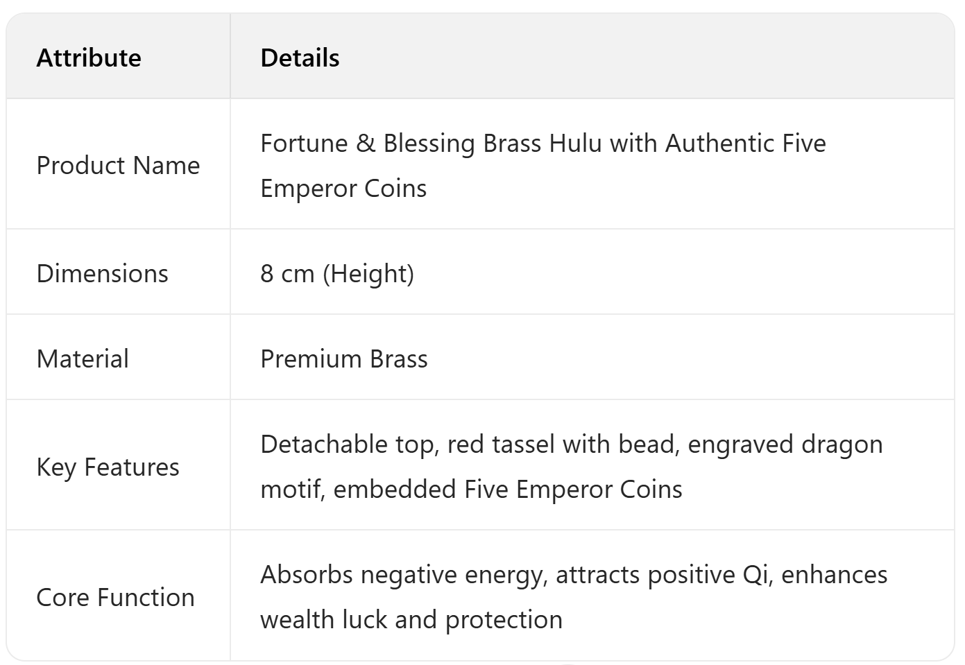 Elevate the energy of your kitchen with our 8cm Fortune & Blessing Brass Hulu. This classic Feng Shui charm is crafted from high-quality brass, featuring a detachable top, vibrant red tassel, and intricate dragon engraving. The embedded Five Emperor Coins are a traditional symbol of wealth and protection, believed to attract abundance and shield your space from negative energy.