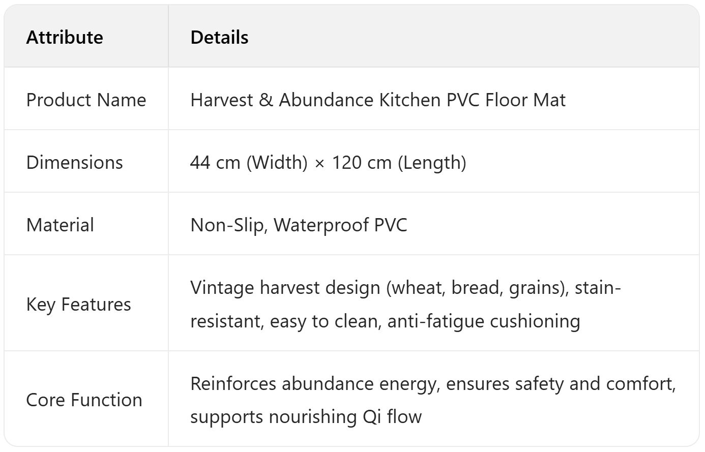 Step into a kitchen filled with abundance and comfort with our Harvest & Abundance Kitchen PVC Floor Mat. Measuring 44cm × 120cm, this non-slip, waterproof mat features a warm, vintage design of wheat, bread, and grains—symbolizing nourishment, prosperity, and the bountiful energy of harvest in Feng Shui.